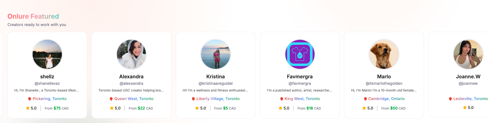 Onlure is an AI-powered, commission-free creator marketplace based in Toronto that connects local businesses with influencers. Businesses describe their needs, and our AI instantly recommends the best local creators by niche, location, budget, and engagement metrics. Creators keep 100% of their earnings with direct booking, messaging, and verified analytics from Instagram, TikTok, and YouTube.